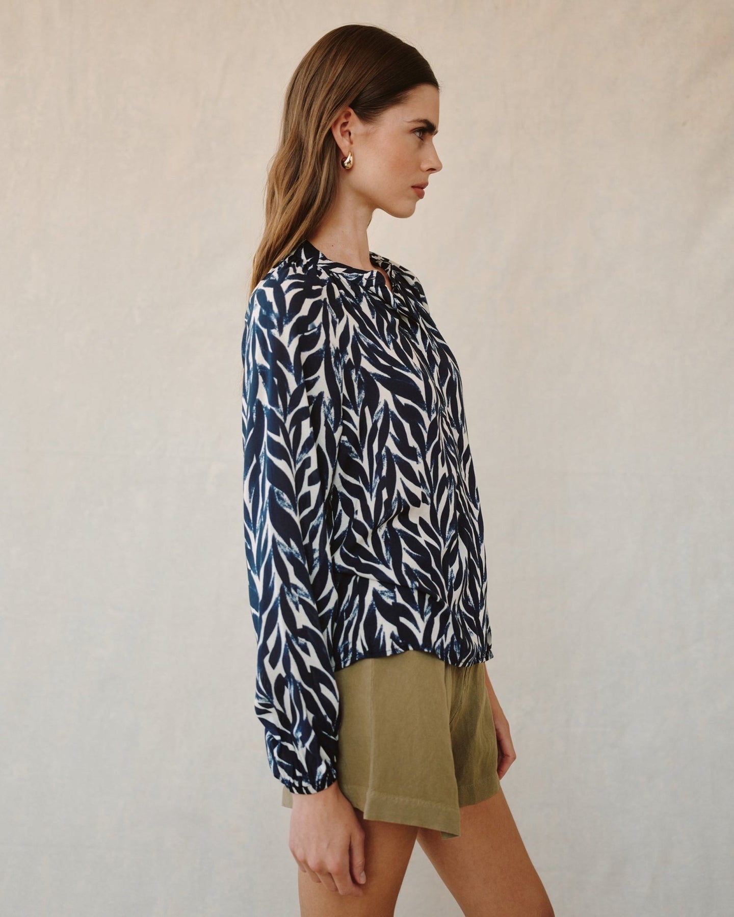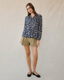 Long Sleeve Shirred Raglan Shirt - Navy Leaves Print