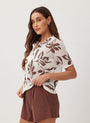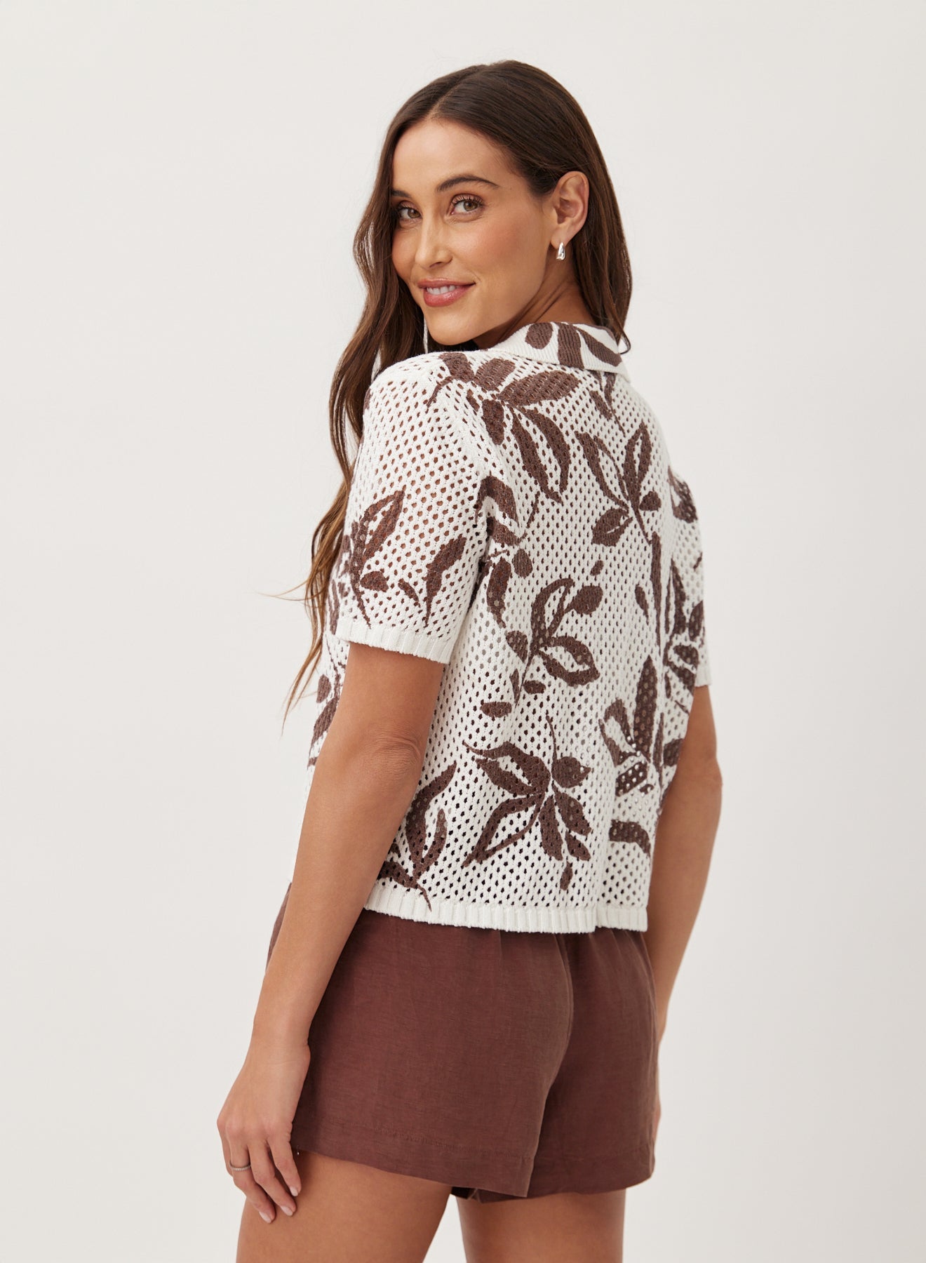 Short Sleeve Button Down Sweater - Brown Palm Print